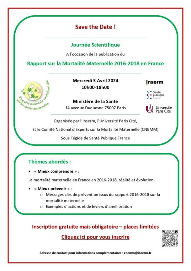 L'Inserm, l'Université Paris Cité et le Comité National d'Experts sur la Mortalité Maternelle (CNEMM) sous l'égide de Santé Publique , vous convient à leur Journée Scientifique à l'occasion de la publication du Rapport sur la Mortalité Maternelle 2016-2018 en France. Pour vous inscrire et en savoir plus sur le programme, veuillez cliquer sur ce lien
